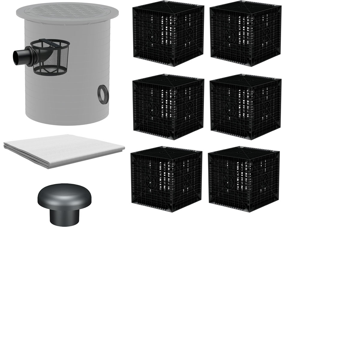 Zum Lieferumfang gehören neben den Sickerboxen der Vorfilter „easy pro“, ein Be- und Entlüfter (ab einem Volumen von 1230 L) sowie das benötigte Geotextil. Dieses schützt die Versickerungsanlage vor Verunreinigungen und gewährleistet eine langlebige Funktion.