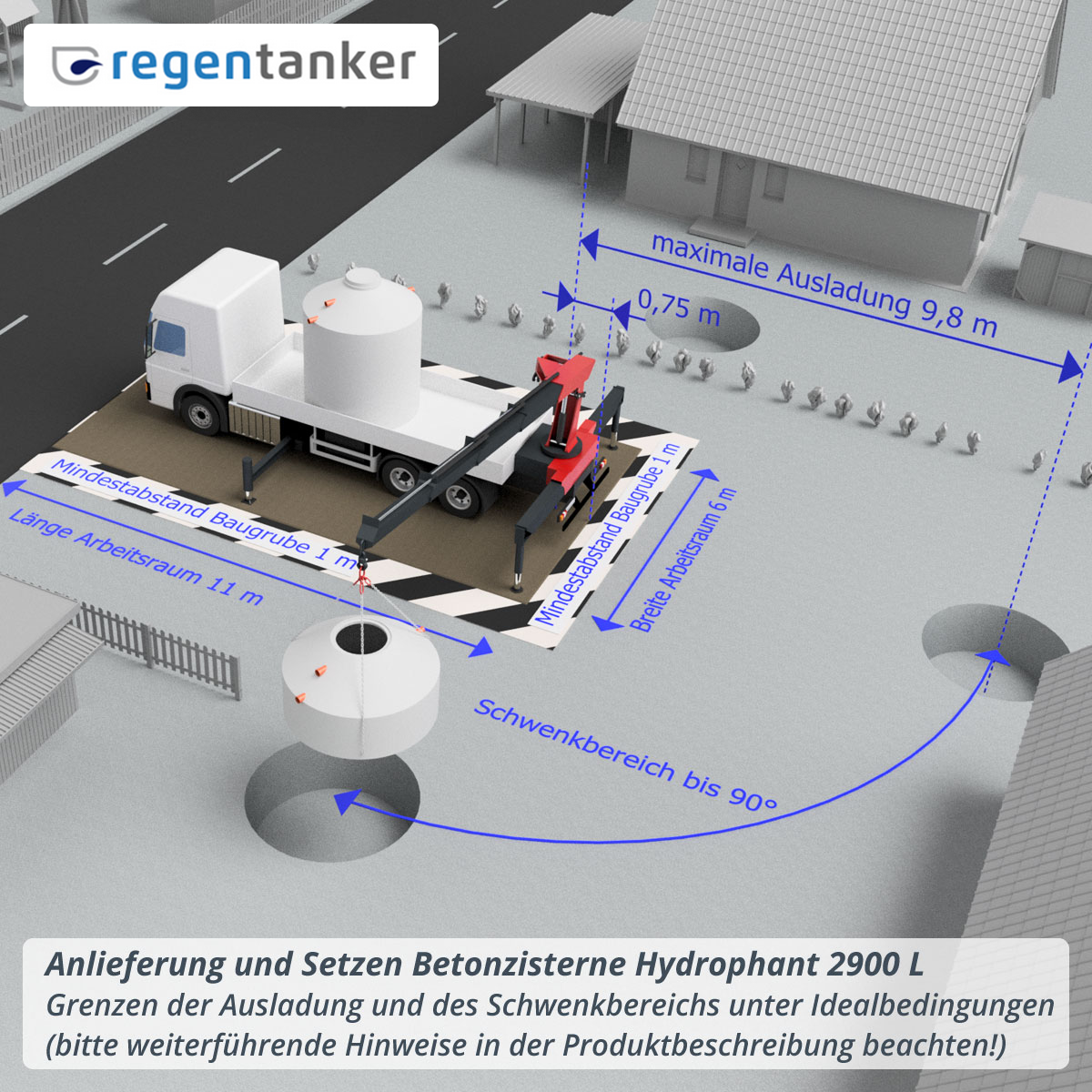 Die Betonzisterne Hydrophant 2900 Liter wird Ihnen direkt per Kranwagen an die Baustelle geliefert und in die vorbereitete Baugrube eingesetzt – zusätzliche Einbauarbeiten entfallen. Die vormontierten PVC-Anschlüsse für Zulauf, Ablauf und technische Versorgungsleitungen ermöglichen eine schnelle und unkomplizierte Installation. Bitte beachten Sie unsere Lieferhinweise, um einen reibungslosen Ablauf sicherzustellen.
