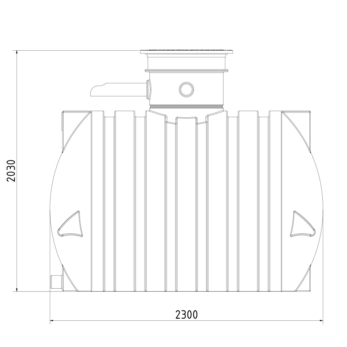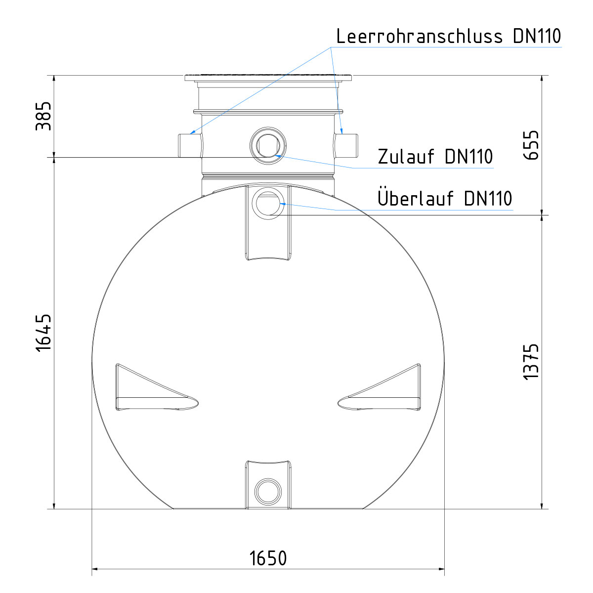 Vier DN100-Anschlüsse sind integraler Bestandteil des Tanks. Zwei Spezialdichtungen für Zulauf und Überlauf sind vormontiert. Zusätzlich stehen zwei Anschlussstutzen zur Verfügung, die Sie bei Bedarf öffnen können, etwa für die Verlegung der Technikleitung.