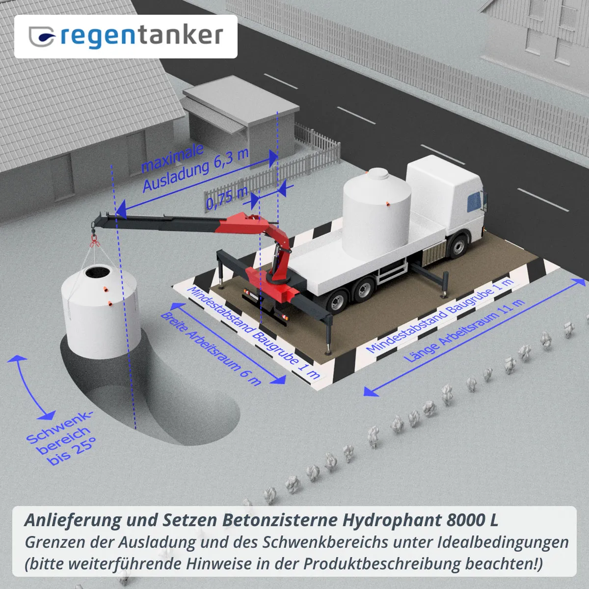 Die Kranlieferung ist ein bedeutender Vorteil für die Installation der Hydrophant Betonzisterne 8000 Liter, da sie eine einfache und schnelle Platzierung in der Baugrube ermöglicht. Allerdings müssen die Liefer- und Versandbedingungen sorgfältig beachtet werden, um sicherzustellen, dass der Lkw ausreichend Platz zum Rangieren hat und der Kran korrekt positioniert werden kann. Weitere Informationen zu den Liefer-, Versand- und Zahlungsbedingungen finden Sie hier. Hier erfahren Sie alles, was Sie wissen müssen, um eine reibungslose Lieferung zu gewährleisten.