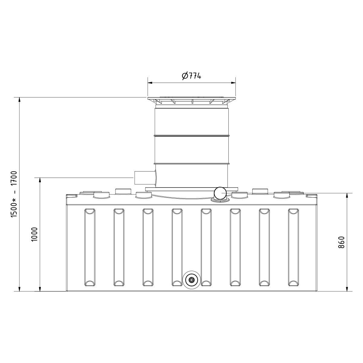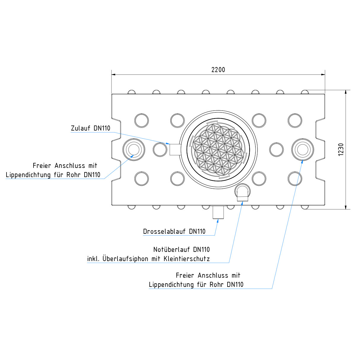 - DN110-Anschlüsse für Zulauf, Retentionsablauf und Technik