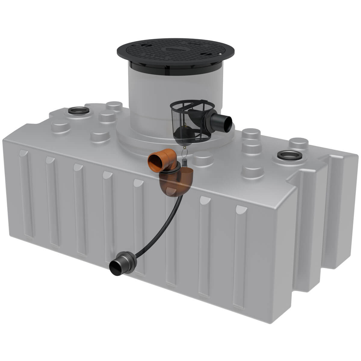 - DN110-Anschlüsse für Zulauf, Retentionsablauf und Technik