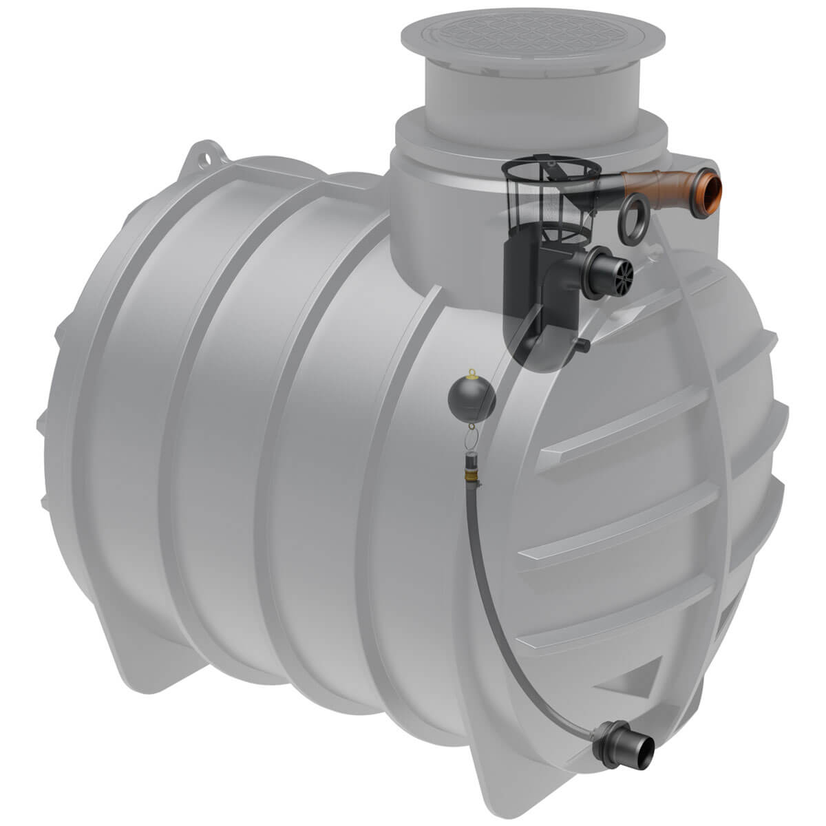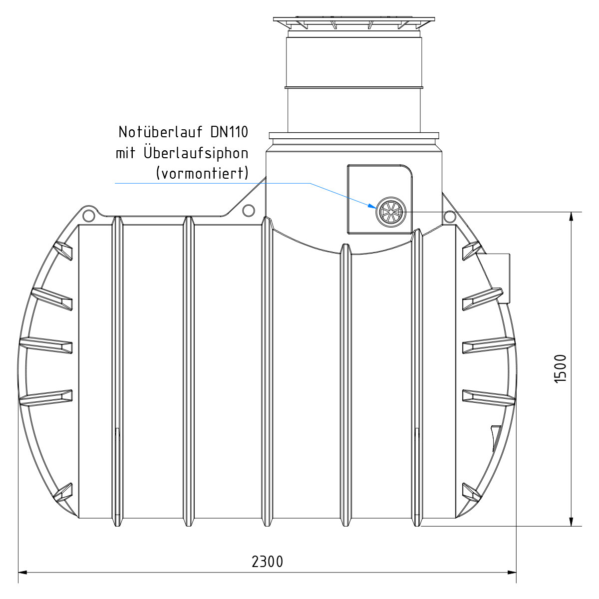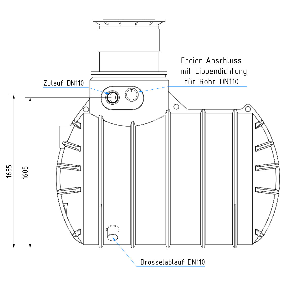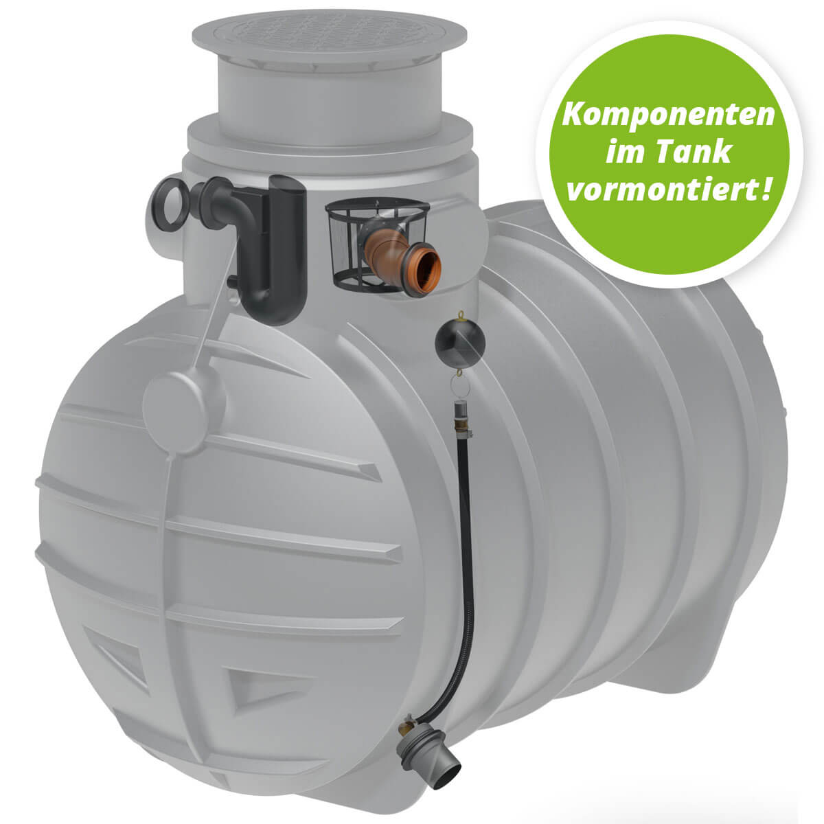 Die Kunststoffzisterne ist standardmäßig mit DN110-Anschlüssen für Überlauf, Technik (Leerrohr) und Retentionsablauf ausgestattet. Zudem gehören folgende vormontierte Komponenten zur Ausstattung: