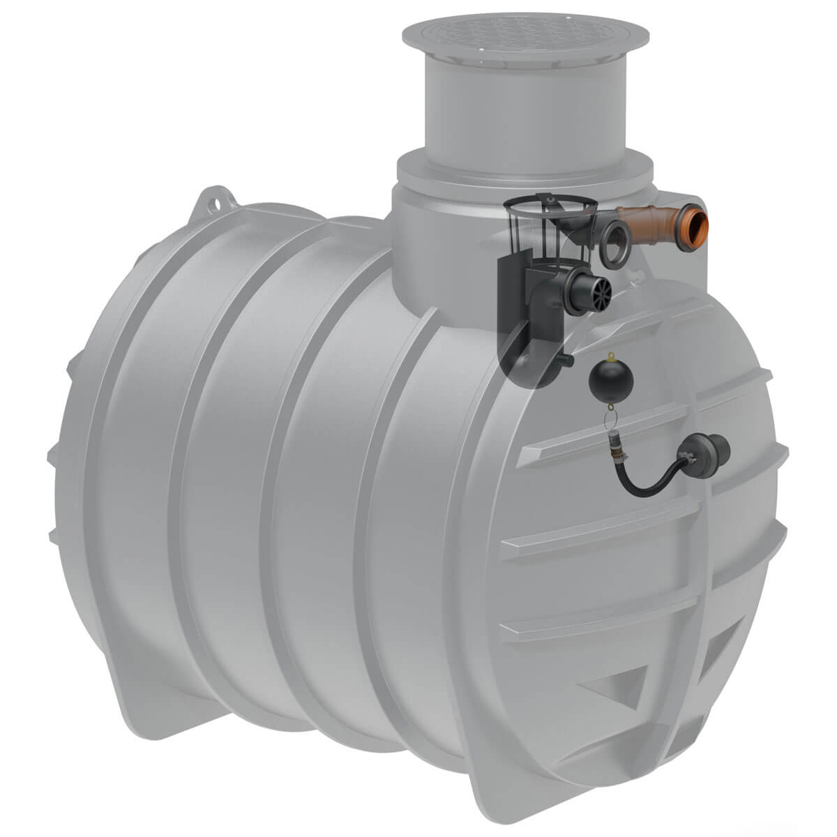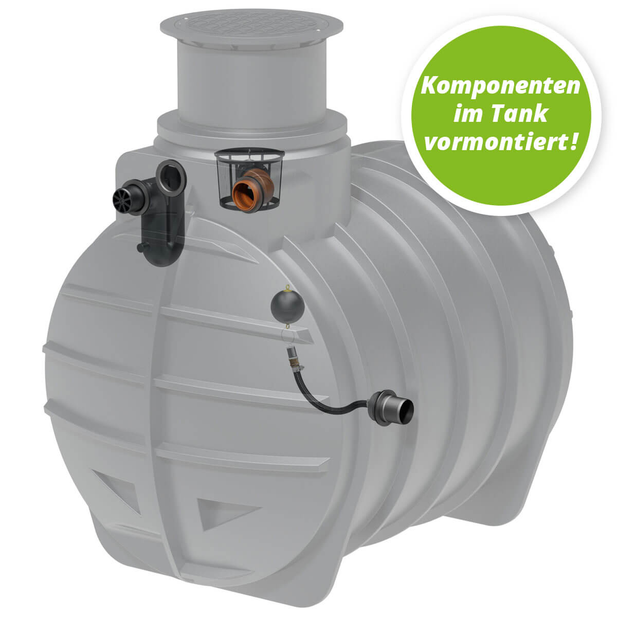 Vormontierte Ausstattung: Drosselventil, Filterkorb und Notüberlauf