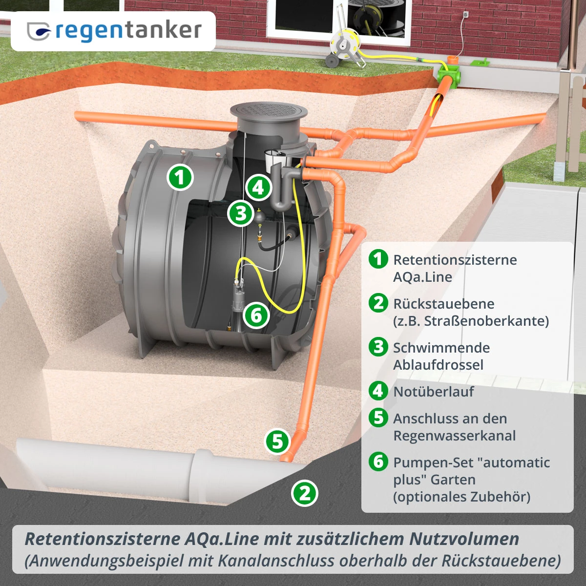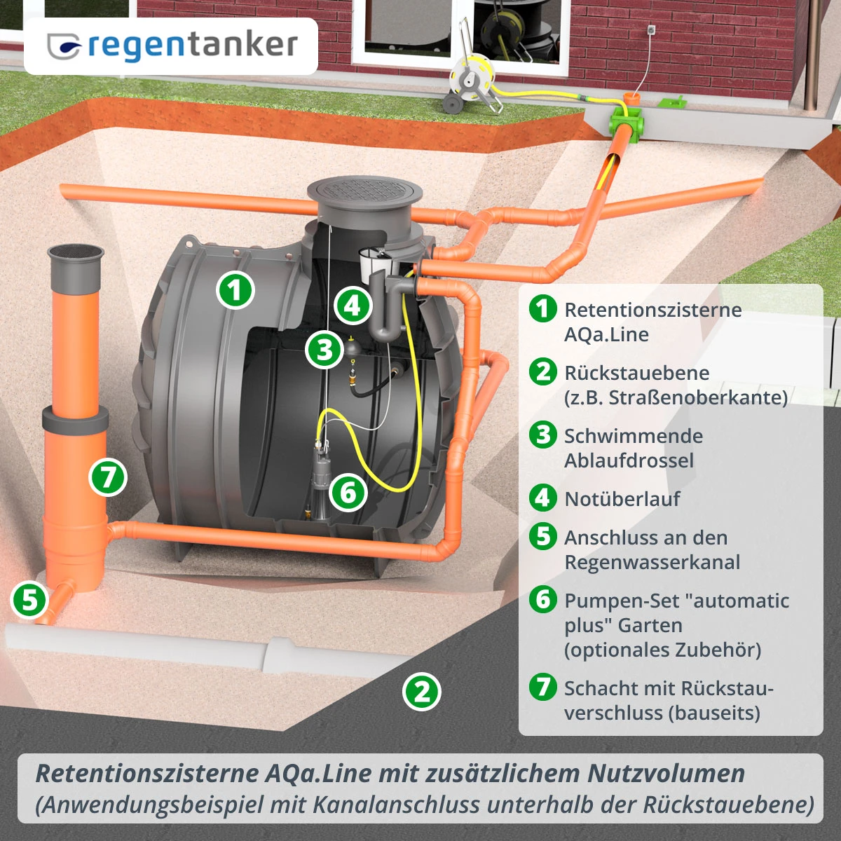 Bitte überprüfen Sie vor dem Einbau die Höhe des Retentionsablaufs in Bezug auf den Regenwasserkanal vor Ort. Falls der Kanal höher liegt, ist der Anschluss möglicherweise nur mit einer Hebeanlage möglich. Liegt der Ablauf der Zisterne unterhalb der Rückstauebene, ist eine Rückstausicherung erforderlich. Bei Fragen dazu helfen wir Ihnen gerne weiter.