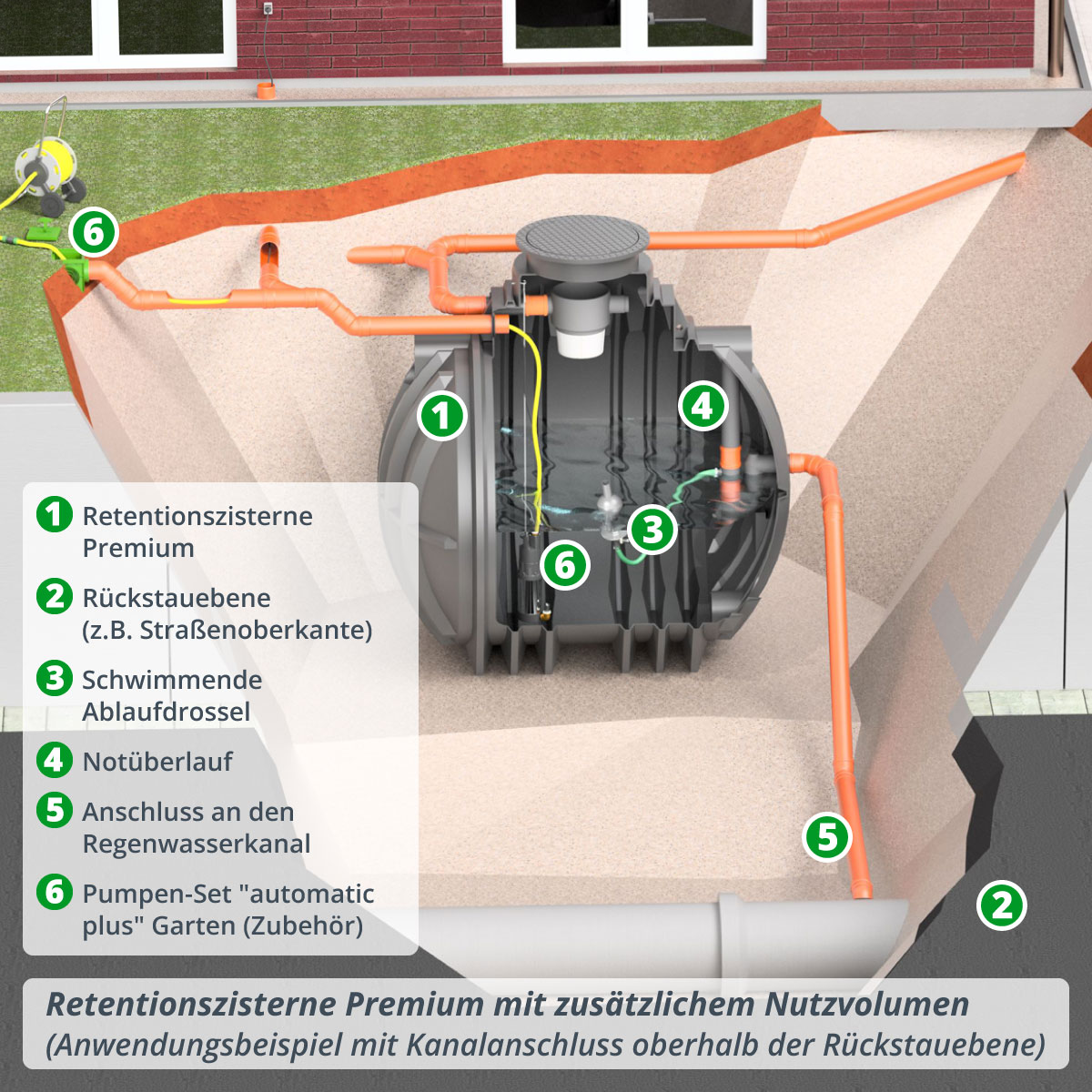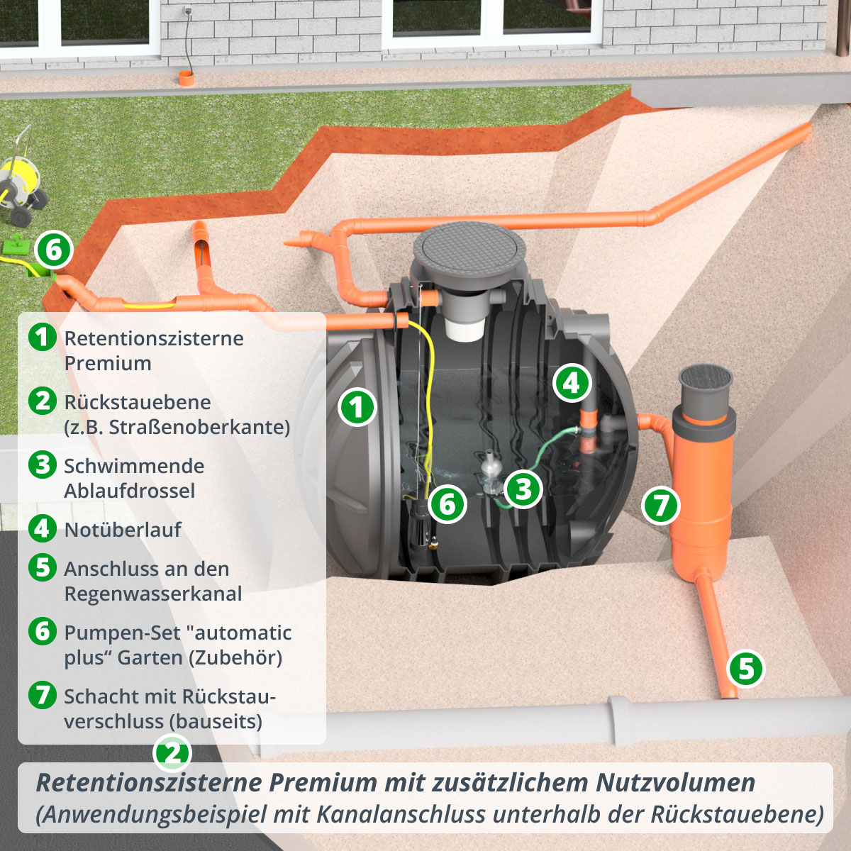 So lässt sich die Retentionszisterne optimal an lokale Gegebenheiten und Auflagen zur Regenwasserrückhaltung anpassen – z. B. zur Entlastung des Kanalnetzes oder als zusätzlicher Wasserspeicher für die Gartenbewässerung.