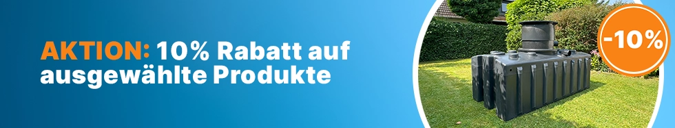 Profitieren Sie jetzt von unserer exklusiven Sonderaktion: Bis zum 13. Oktober 2025 erhalten Sie 10% Rabatt auf ausgewählte Produkte, darunter Zisternen, Regenwasseranlagen, Abwasserflachtanks und vieles mehr. Sichern Sie sich hochwertige Lösungen rund um Wasser- und Abwassertechnik zu besonders attraktiven Konditionen – aber nur für kurze Zeit und solange der Vorrat reicht!